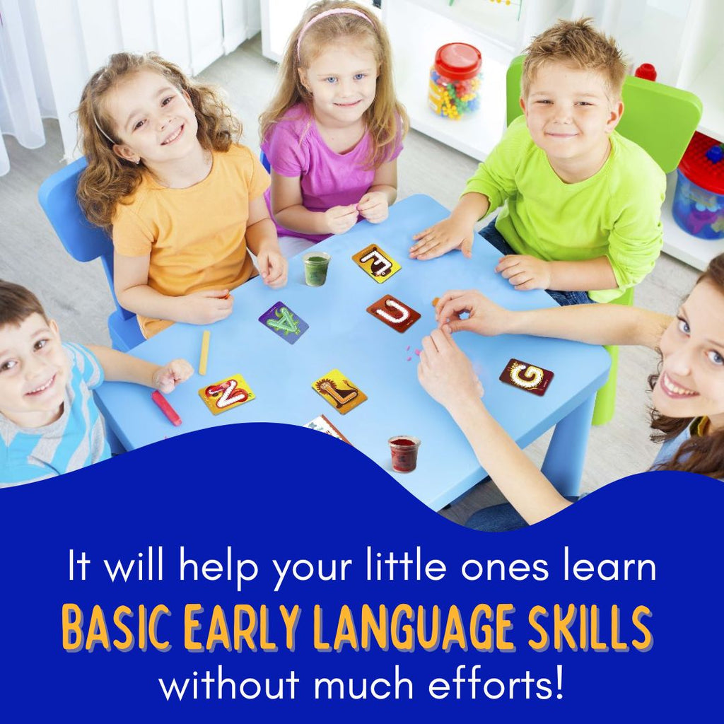 Contains: 26 Alphabet Cards, 5 Extra Vowel Cards, 1 Blank wild Card + 4 non-toxic dough + 1 shaping tool