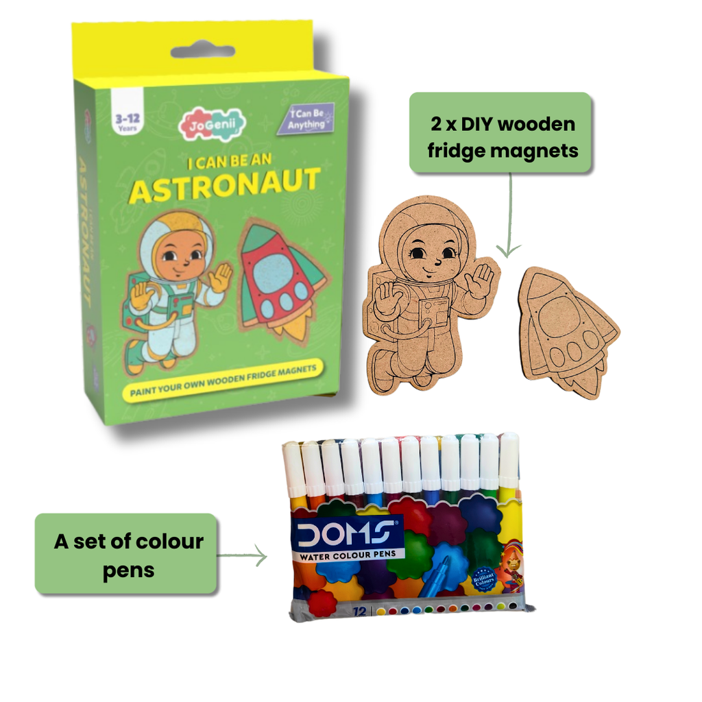 • 2 jumbo MDF fridge magnets (rocket + astronaut) to decorate