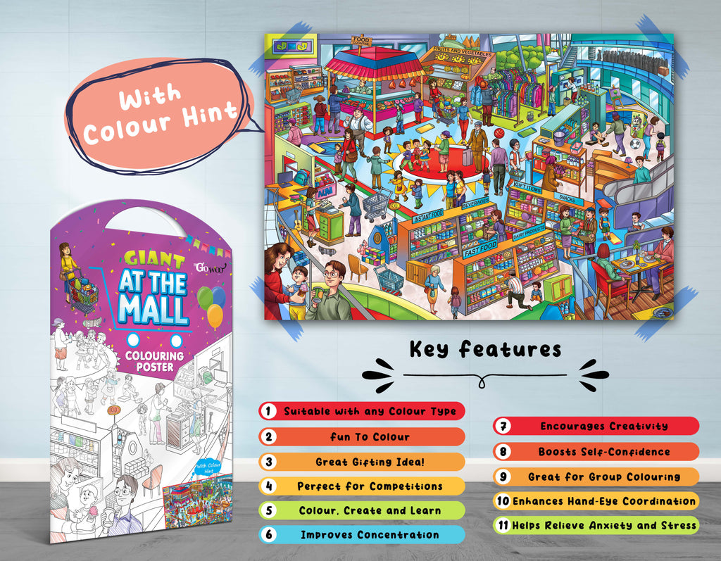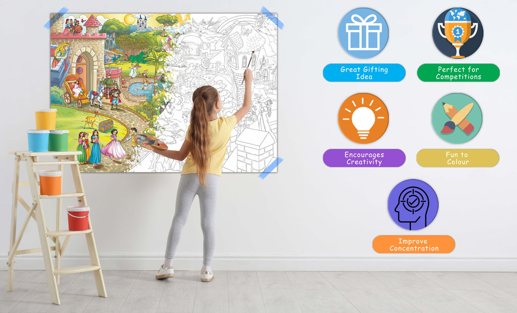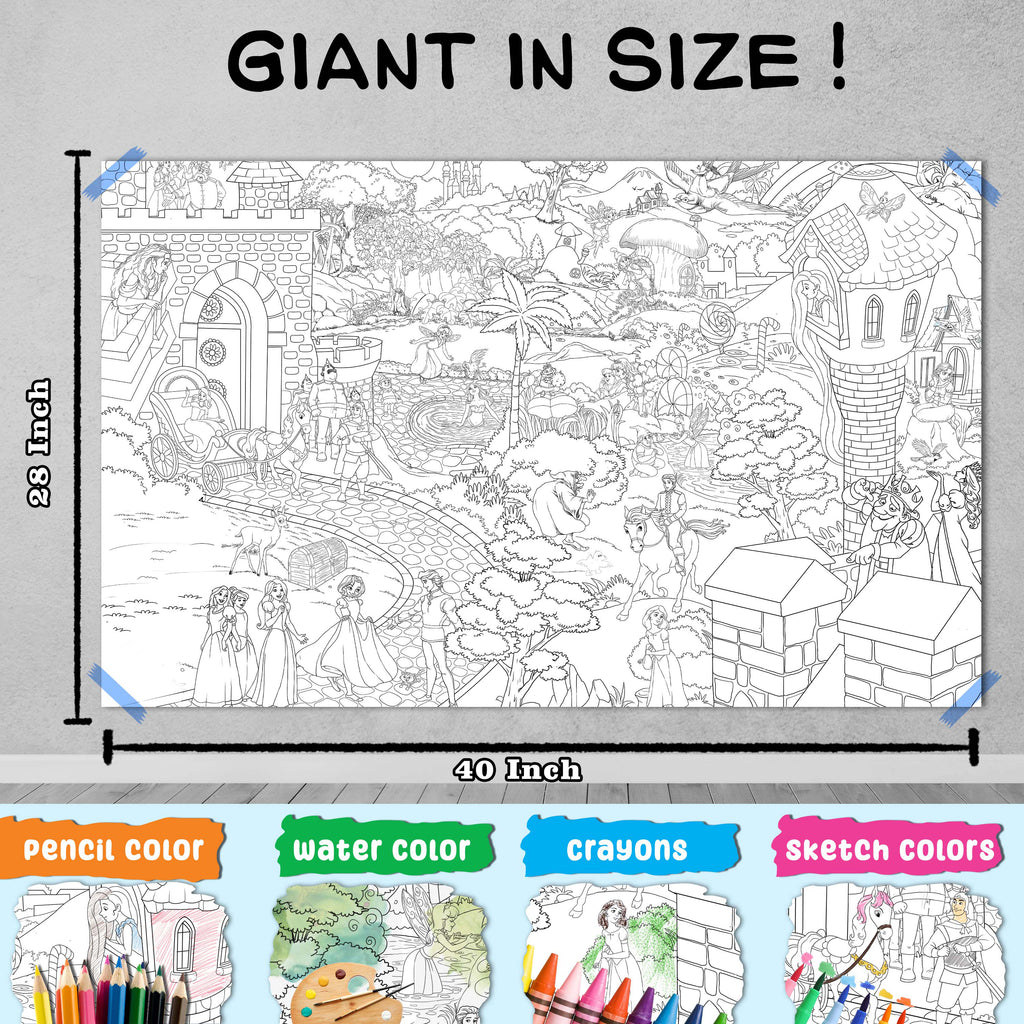 The posters are generously sized, measuring 28*40 inches each, and feature stunning illustrations that will capture the imagination of anyone who sets eyes on them. Whether it's the lush landscapes of the jungle, the regal architecture of the princess castle, the bustling activity of the mall, or the prehistoric creatures of the dinosaur era, each poster offers a unique and engaging colouring experience.