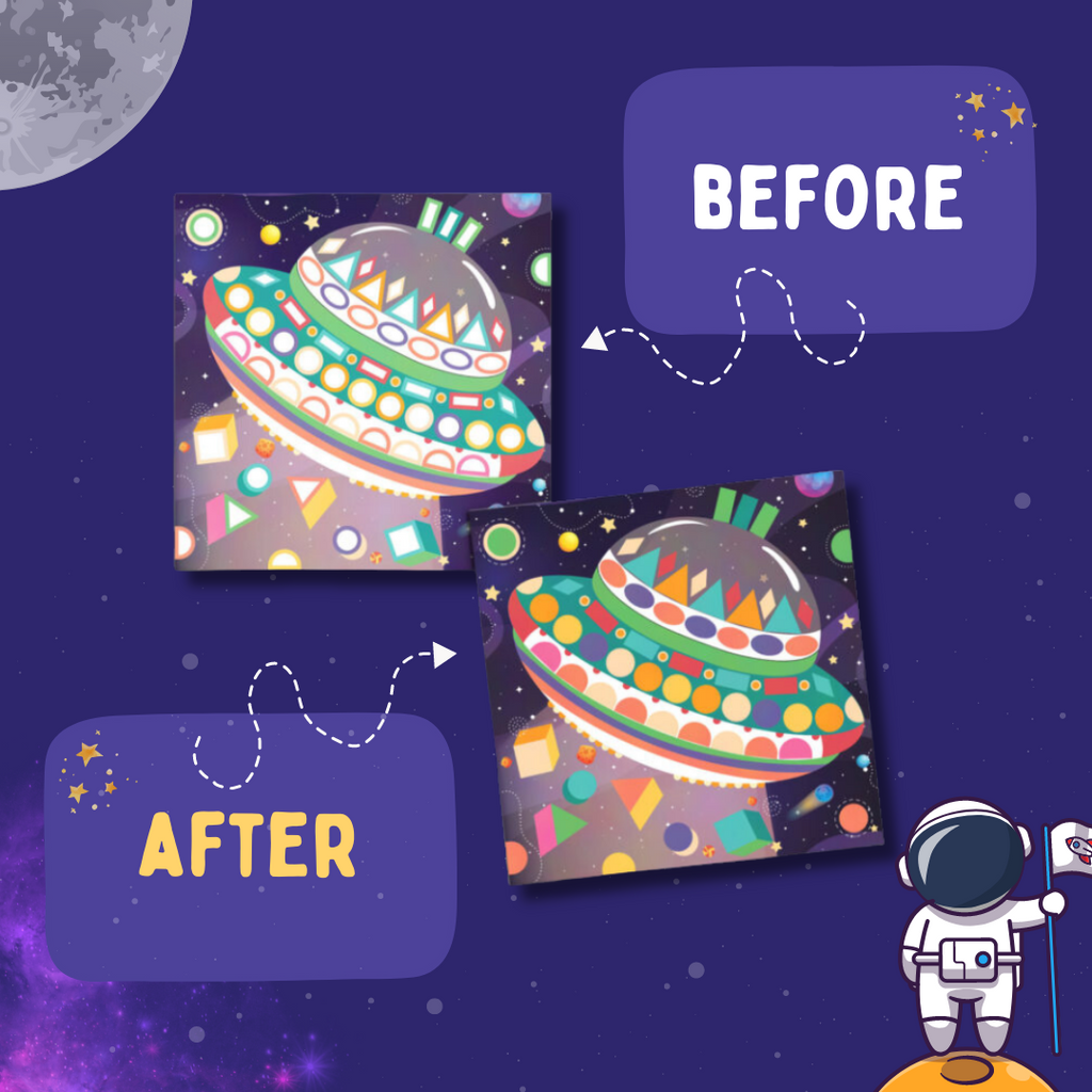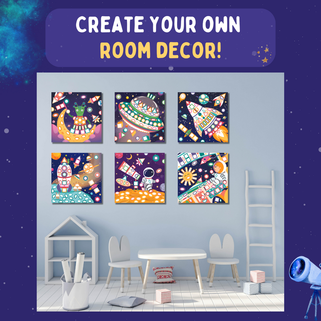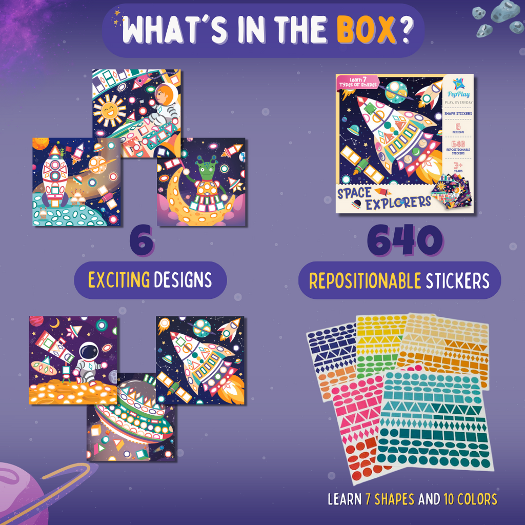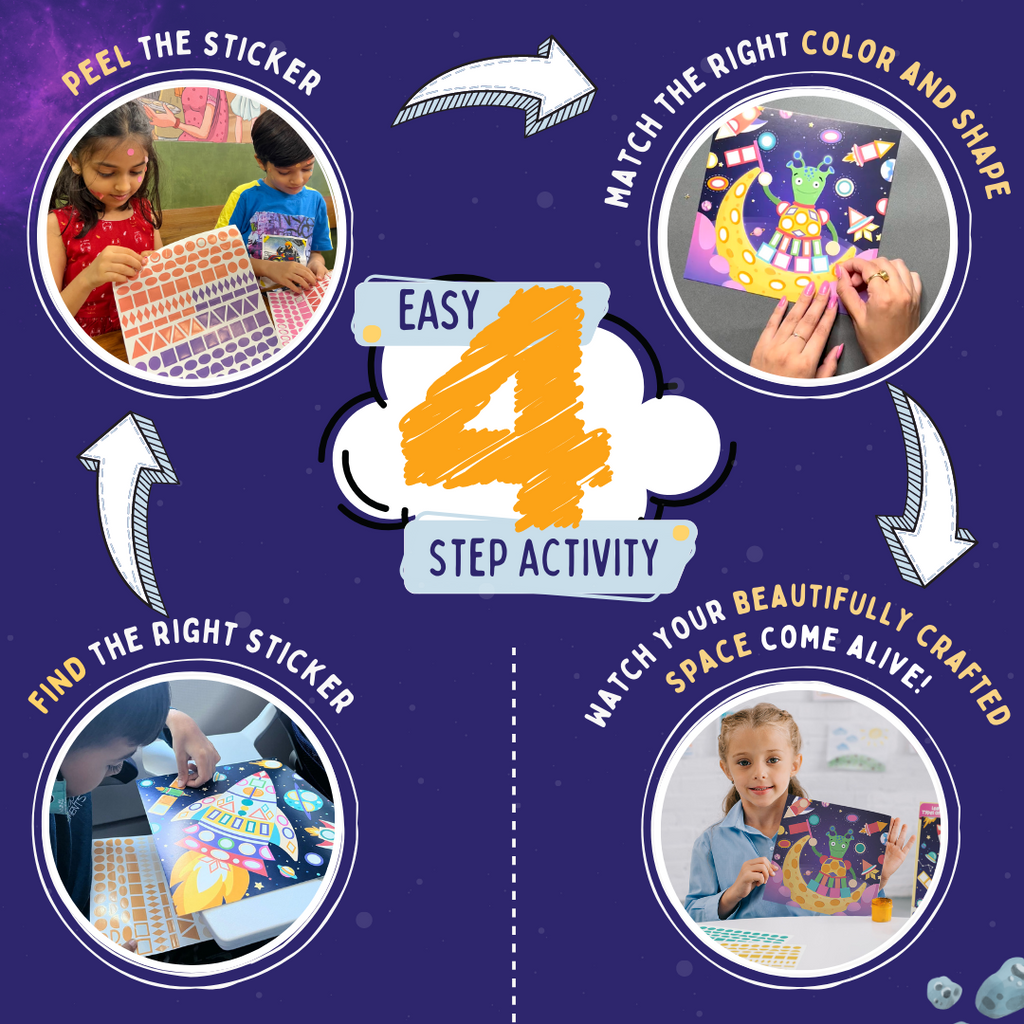 Brace yourselves and Get. Set. Go all the way to the space! Enter the world of space with cool astronauts, say hello to the aliens and enjoy a ride in the UFO and rockets! All of this and much more as you enter the mystic world of space with this pack of 6 shape sticker scenes!
