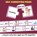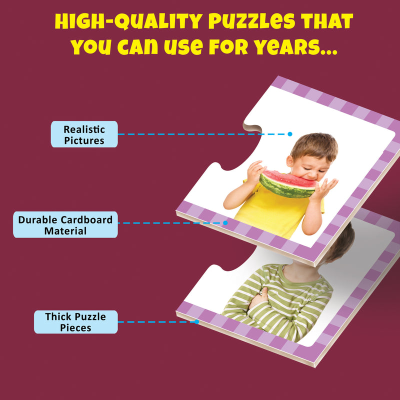 Each matching puzzle features one simple everyday action word on one piece and the full-color illustration of the word on the other.