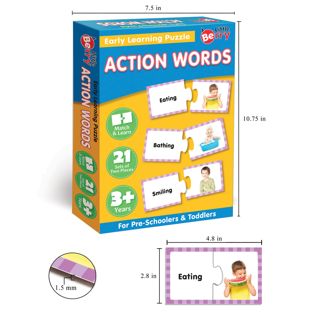 Build new kindergarten readiness skills, one piece at a time! Get your little ones learning and playing at the same time with the Action Words Puzzle from Little Berry. This set of 21 colorful two-piece puzzles helps kids master early language and grammar skills through brain-teasing puzzle play.