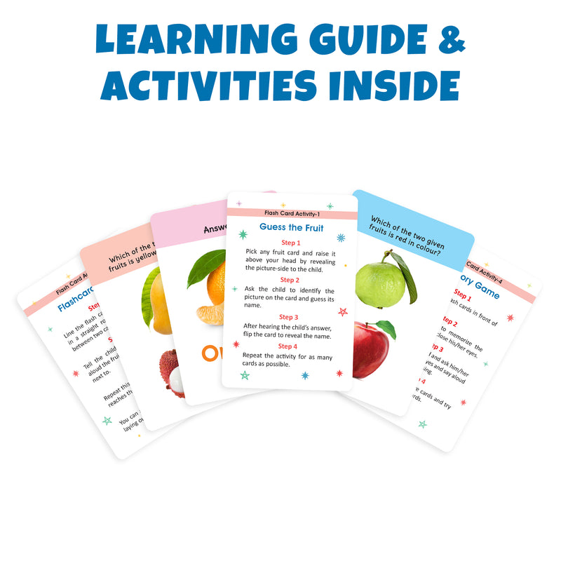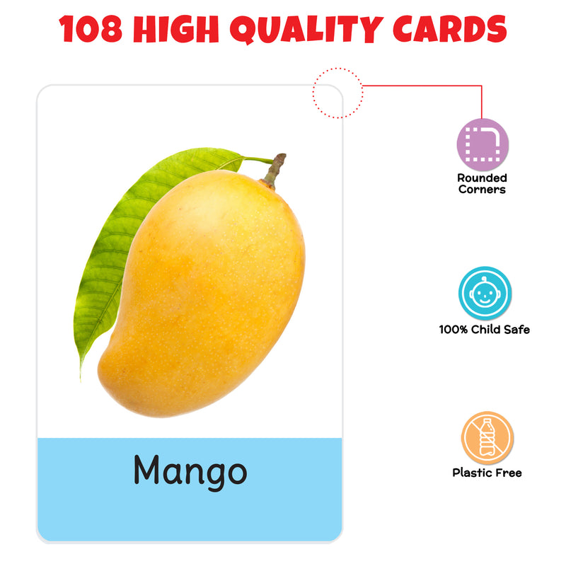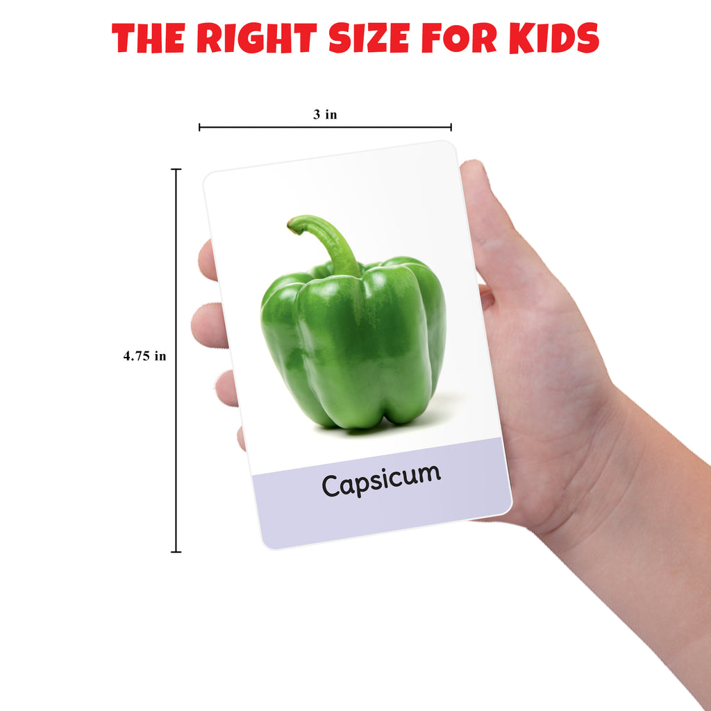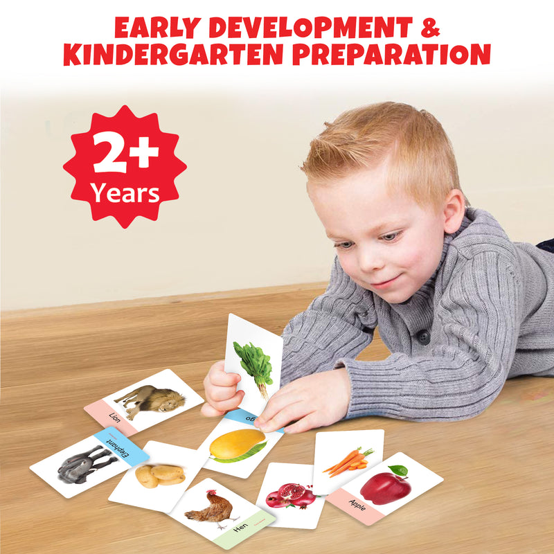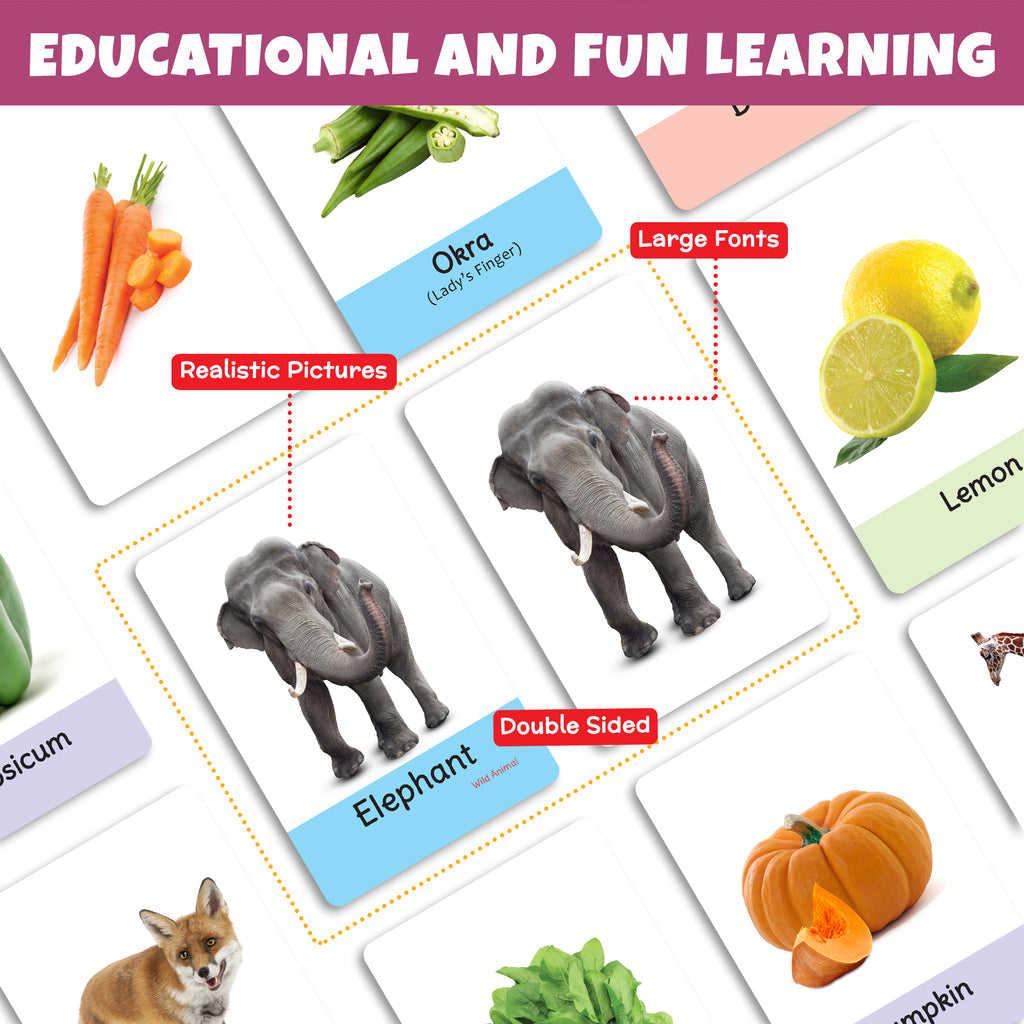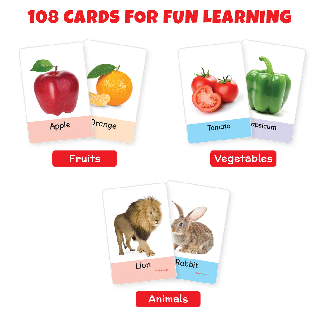* FUN AND EDUCATIONAL: Designed by experienced educators, these double-sided flashcards feature colourful and attention-grabbing realistic images. Kids learn all about different fruits, vegetables and animals, through play.