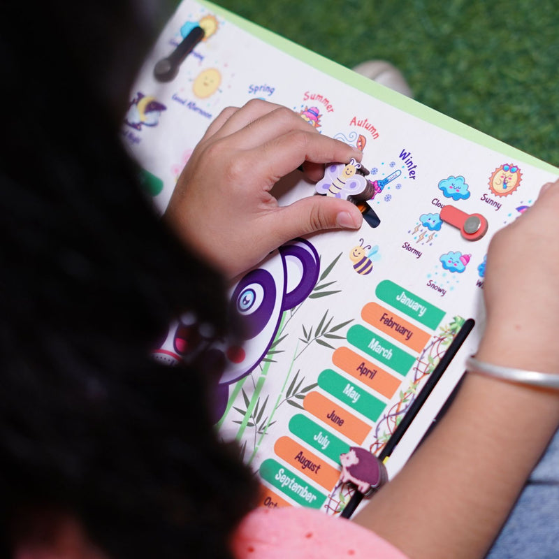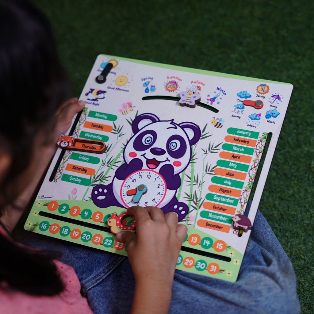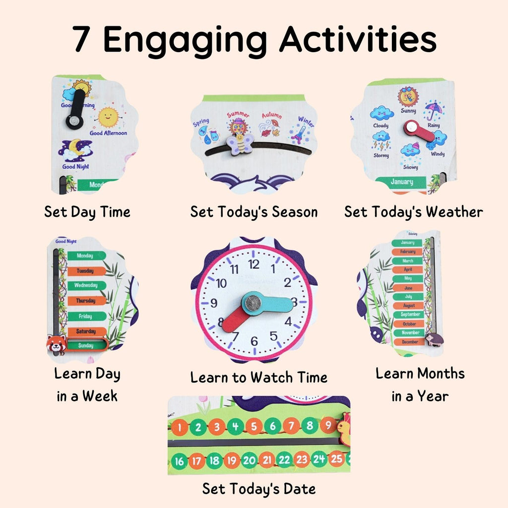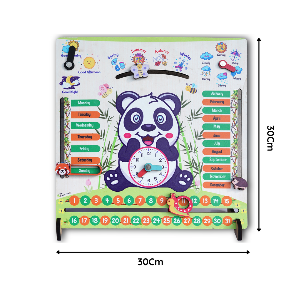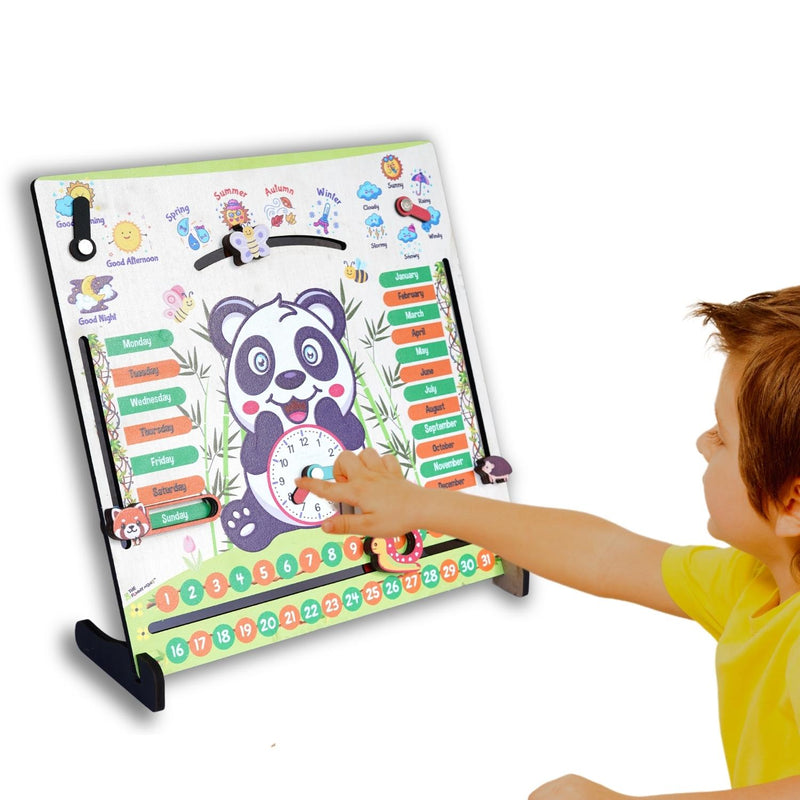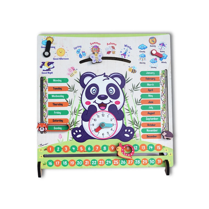 PRE-LEARNING WOODEN MONTESSORI TOY FOR KIDS- Your kids will learn about the seasons, months, days of the week, weather and time in the most amazing and creative way with this bright and various colors panda theme wooden teaching clock board toys for kids, babies and toddlers.